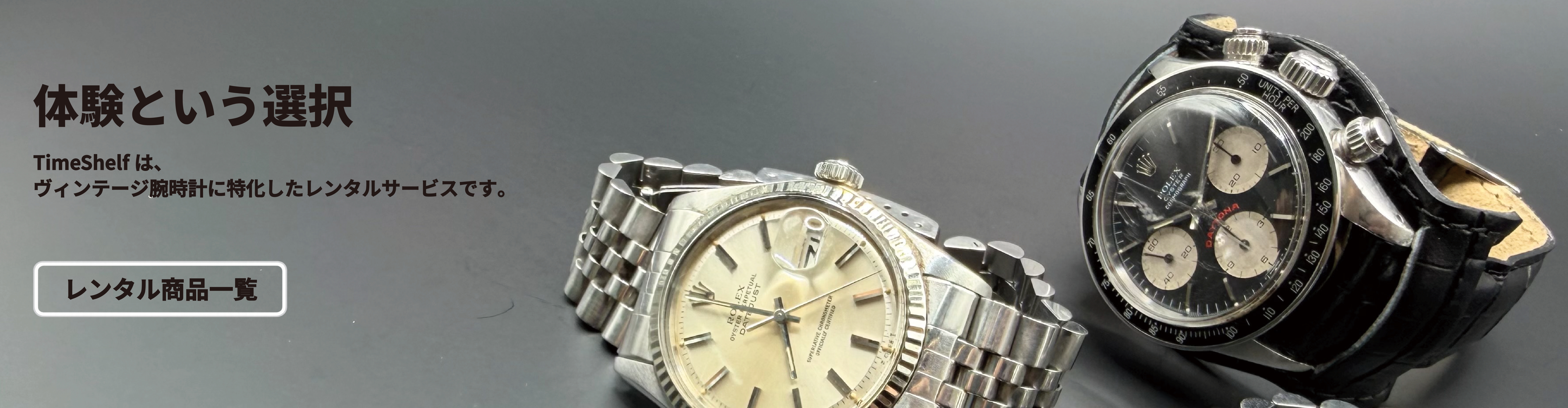 これまでのTimeShelfでは、ROLEX Ref.6263 / Ser.6412345(通称:信長デイトナ)の装着体験を中心にサービスを展開してまいりました。多くの方にご関心をお寄せいただく中で、「他の時計も体験してみたい」というお客様からのご要望を多数いただき、このたびラインナップを拡充したレンタルサービスとして新たにスタートいたします。